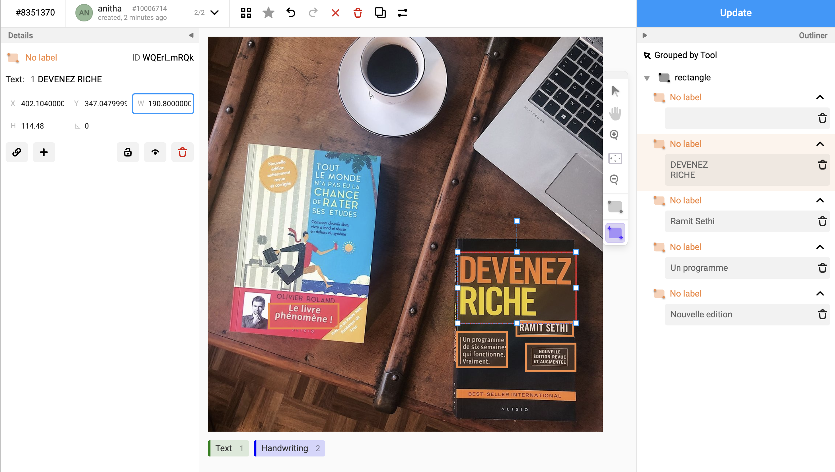 To add a region in the OCR transcription templates, draw a rectangle, and you can see a text box that appears in the Outliner panel to enter OCR text. The new functionality allows you to select a region and the Details panel changes. You can experience the following: